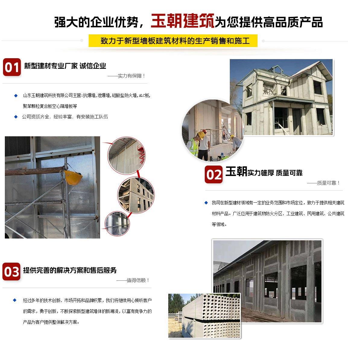 山东玉朝建筑科技有限公司,承接抗爆墙,泄爆墙,硅酸盐防火墙项目的设计施工,并且生产聚苯颗粒轻质隔墙板、蒸压加气混凝土墙板(ALC墙板)及空心隔墙板。公司响应墙改政策,充分吸收国内外新技术,成功研发了新型轻质墙板。公司实行标准化管理,严格控制产品质量,依靠过硬的产品质量的服务已得到广大客户的认可与信赖。公司产品遍布各大城市,与国内、国外多家客户建立了良好的合作关系。公司始终以“客户价值很大化”为宗旨,坚持“精益求精、诚而有信”的经营理念,致力于低碳环保产业的发展,愿与各界朋友共创共赢!